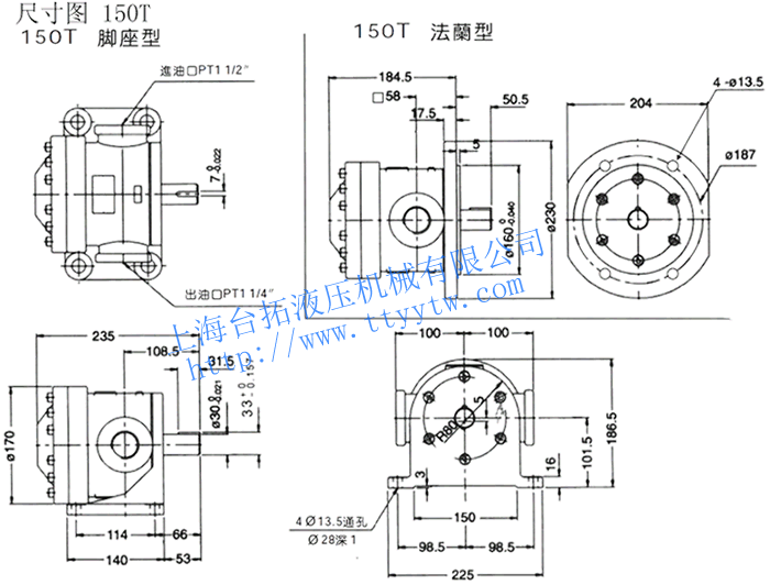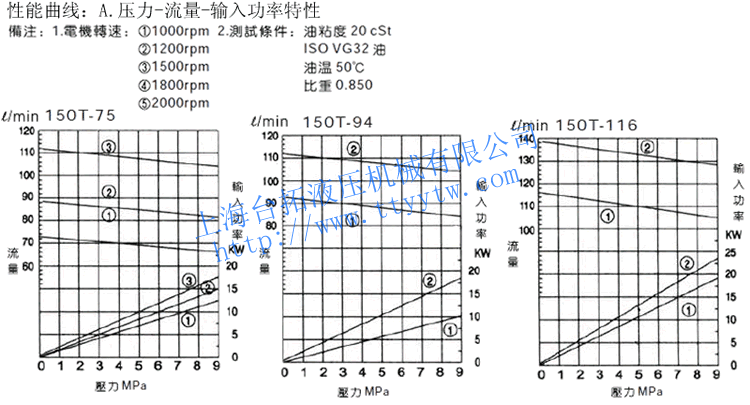 壓力kgf/cm2回轉速度r.p.m 配管尺寸PT 重量(kg) 回轉速度r.p.m 1000 1200 1500 1800 最高 最低 入口 出口 腳座型 法蘭型 150T-48 48.2 58.0 72.6 86.8 70 1500 800 1 1/2" 1 1/4" 26 25 150T-61 61.4 73.8 92.0 110.6 150T-75 75.0 90.5 113.1 135.6 150T-94 94.0 113.1 141.3 150T-116 116.2 139.5 174.2