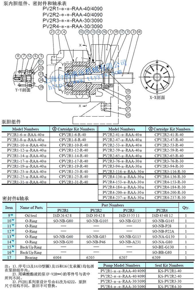 高壓定量葉片泵PV2R4泵內(nèi)膽組件、密封件和軸承表下載