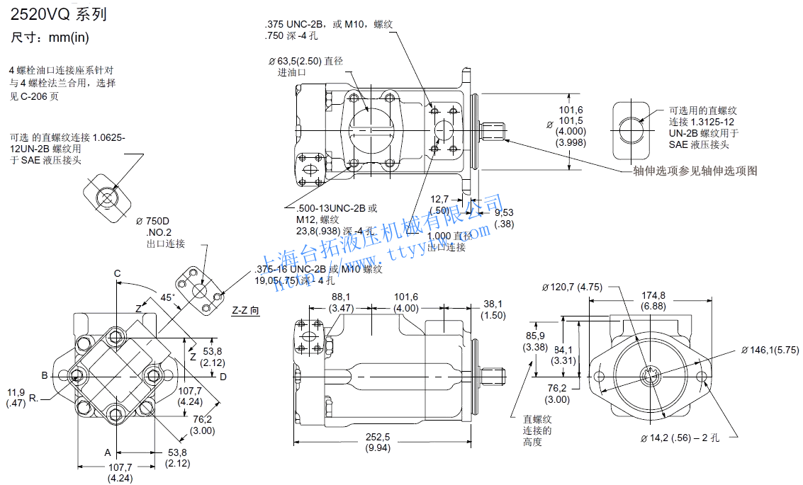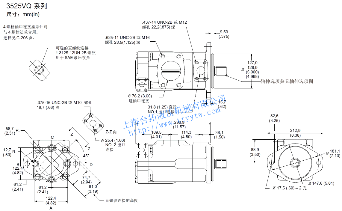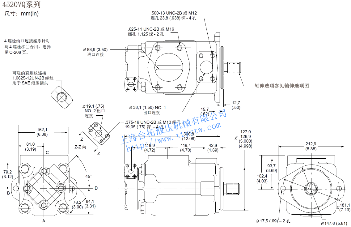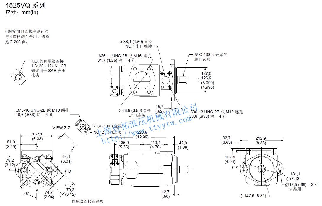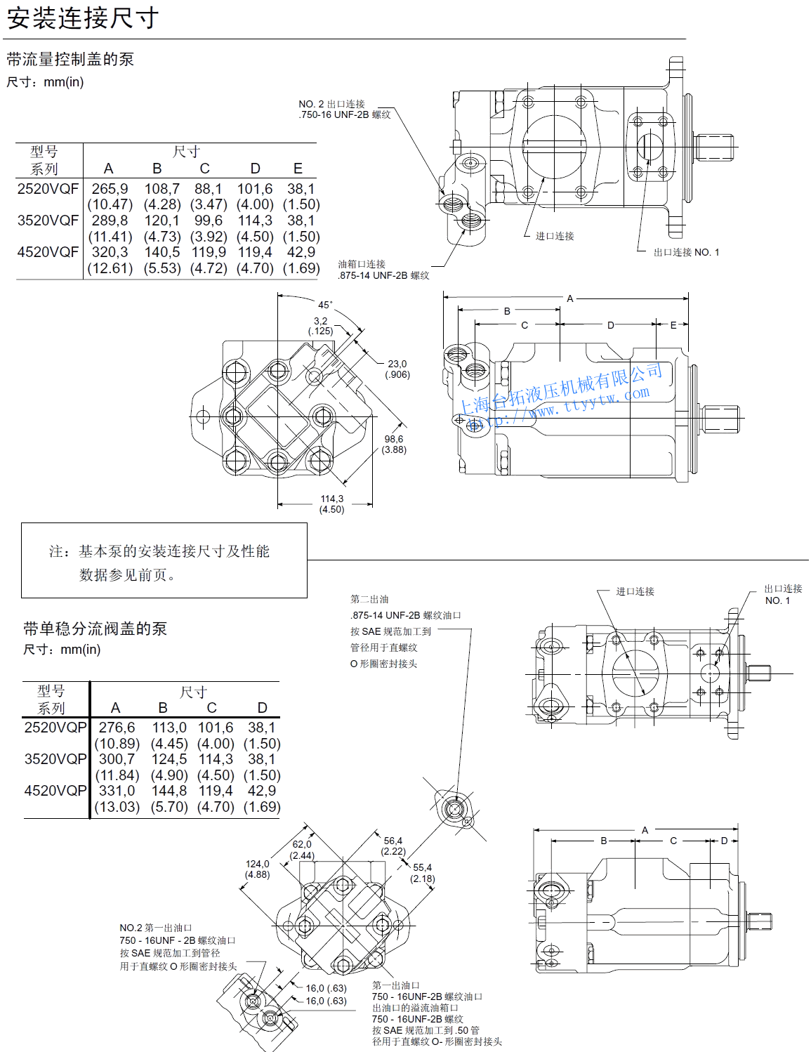 KW2520VQ 12 40.2 2700 210 88.5 41.0 5 18.0 2700 210 42.3 17.9 20.5 8 27.4 210 65.4 26.1 14 45.4 2700 103.8 46.6 11 36.4 210 88.5 35.4 17 55.2 2500 119.2 51.8 12 39.5 160 98.1 28.4 21 67.7 2500 146.2 61.9 14 45.9 140 115.4 29.1 3520VQ 25 81.6 2500 210 173.1 75.3 5 18.0 2500 210 38.5 16.5 34.0 8 27.4 210 61.5 24.0 30 97.7 2500 211.5 87.7 11 36.4 210 80.8 33.0 35 112.8 2400 230.8 98.5 12 39.5 160 90.4 26.1 38 121.6 2400 250.0 104.4 14 45.9 140 105.8 26.8 3525VQ 25 81.6 2500 210 173.1 75.3 12 40.2 2500 210 79.5 38.0 34.5 30 97.7 2500 211.5 87.7 14 45.4 210 91.0 43.0 35 112.8 2400 230.8 98.5 17 55.2 210 119.2 51.5 38 121.6 2400 250.0 104.4 21 67.5 210 146.2 61.9 4520VQ 42 138.7 2200 175 255.8 91.4 5 18.0 2200 210 32.0 14.5 43.0 8 27.4 210 51.0 21.0 50 162.3 2200 303.8 105.2 11 36.4 210 68.0 28.5 12 39.5 160 77.5 23.0 60 193.4 2200 369.2 126.8 14 45.9 140 91.0 24.0 4525VQ 42 138.7 2200 175 255.8 91.4 12 40.2 2200 210 68.0 33.0 46.0 14 45.4 210 79.5 38.0 50 162.3 2200 303.8 105.2 17 55.2 210 100.0 45.5 60 193.4 2200 369.2 126.8 21 67.5 210 125.0 54.5 4535VQ 42 138.7 2200 175 255.8 91.4 25 81.6 2200 210 145.5 66.5 53.6 30 97.7 210 178.0 77.5 50 162.3 2200 303.8 105.2 35 112.8 210 211.5 89.5 60 193.4 2200 369.2 126.8 38 121.6 210 223.0 97.0 備注:性能常數(shù):SAE 10W油液@82℃(180華氏度),泵進(jìn)口@0PSIG(14.7PSIA),出口壓力必須始終高于進(jìn)口壓力。