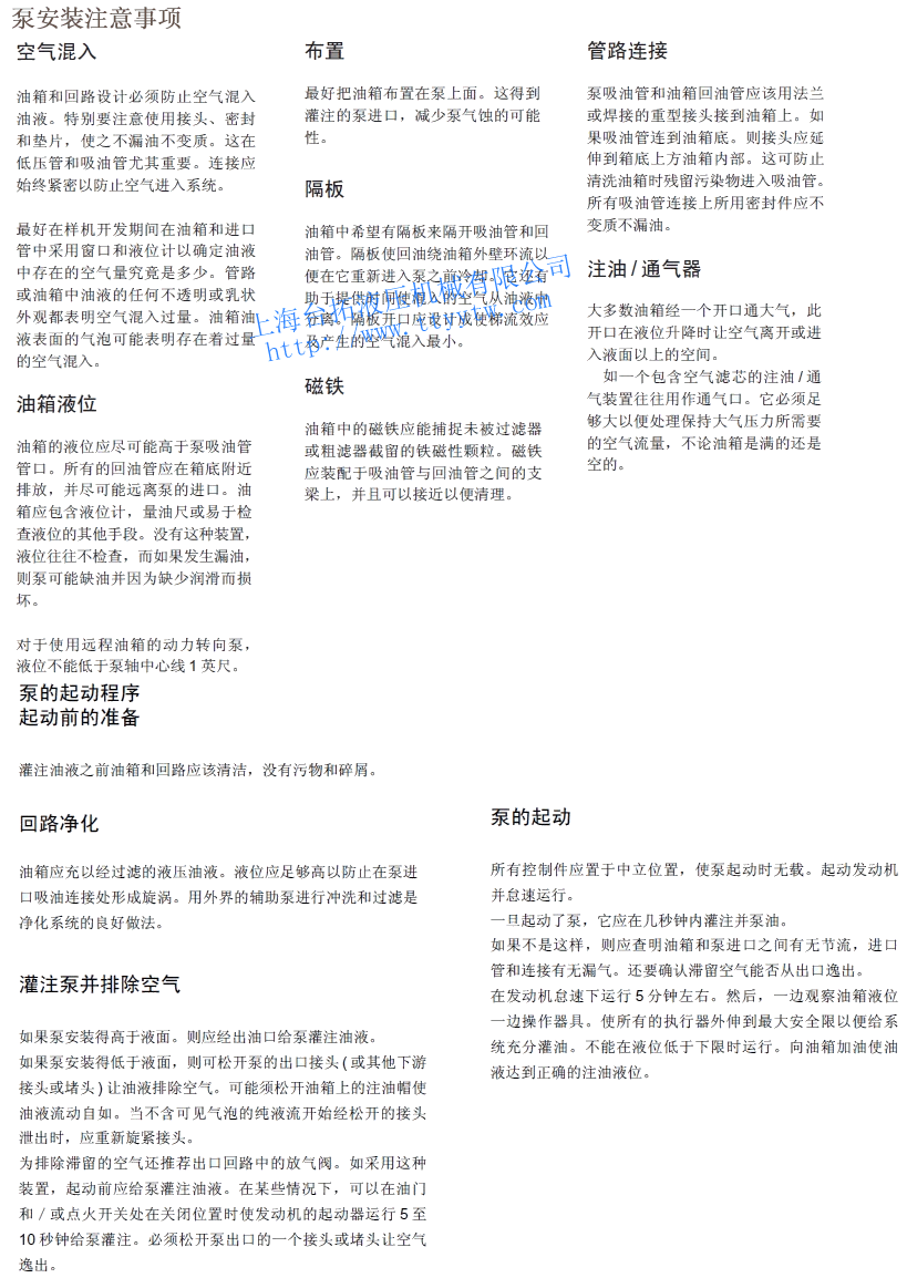 使用說(shuō)明:1、高壓雙聯(lián)子母葉片泵冷啟動(dòng):當(dāng)使用SAE10W油在860至54cst范圍內(nèi)工作時(shí),轉(zhuǎn)速和壓力應(yīng)限制在它們各自額定的50%以內(nèi),直到系統(tǒng)熱起來(lái)。油液粘度超過(guò)860cst啟動(dòng)時(shí)要特別注意,要使整個(gè)系統(tǒng)包括遠(yuǎn)處的缸和馬達(dá)都熱起來(lái)。