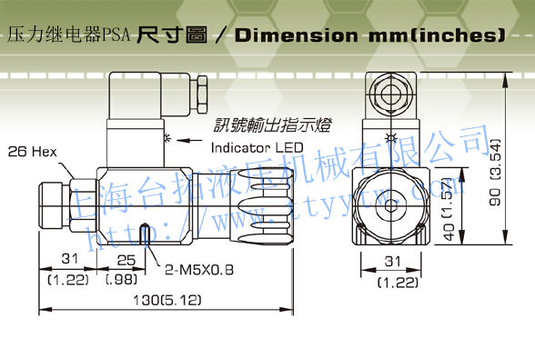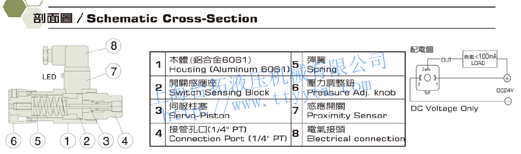 1、壓力繼電器PSA壓力直讀式,24VDC電晶體感應(yīng)開關(guān),無接點NPN集極開放,電晶體輸出式油電壓力開關(guān),連接牙口RC1/4",高負(fù)載:24VDC<100mA。