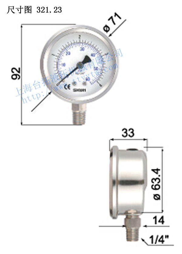 型號(hào) 充油式不銹鋼壓力表321.23 尺寸大小 63mm 精確度 Class±1.5% 壓力范圍 -1/0~-1+20kg/cm2(bar) 0/1~0/1000kg/cm2(bar) 溫度范圍限制 運(yùn)轉(zhuǎn)時(shí)溫度最大值60℃(因考慮傳導(dǎo)特性),周圍溫度約-25℃~60℃ 接頭尺寸與材質(zhì) AISI316直立或埋入
