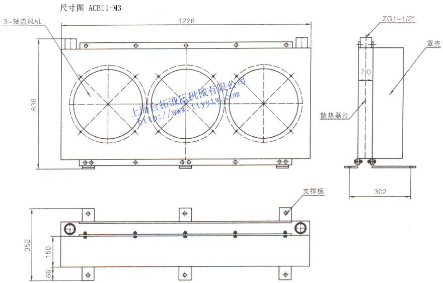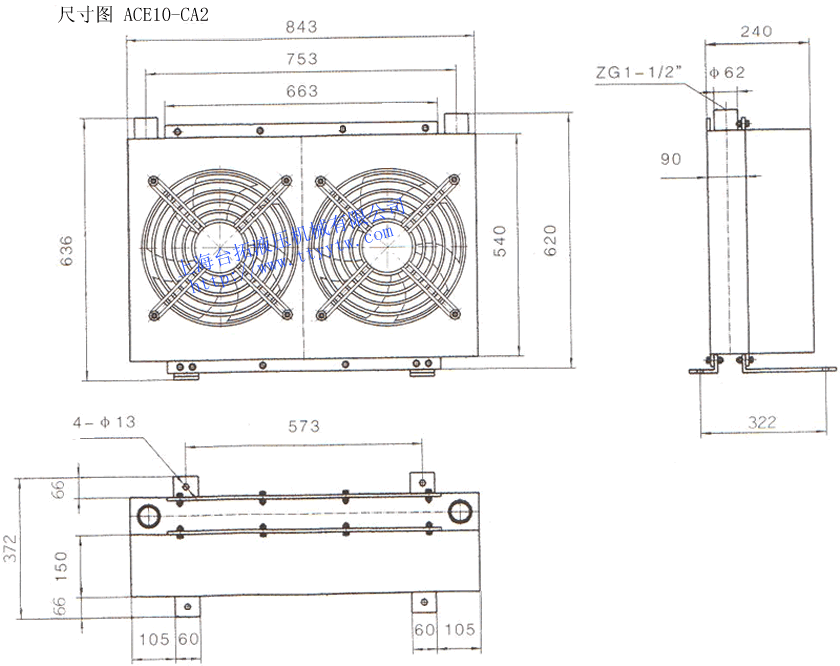 型號 牙口ZG 通過量?/min 工作壓力MPa 最高壓力MPa 風扇功率W ACE1-M2 M18×1.5 10 2.0 2.5 30 ACE2-M2 M18×1.5 20 2.0 2.5 40 ACE3-M1 M18×1.5 25 2.0 2.5 65 ACE4-M1 M22×1.5 30 2.0 2.5 65 ACE4-M2 M22×1.5 60 2.0 2.5 130 ACE5-M1 M27×1.5 55 2.0 2.5 100 ACE6-M1 M27×2 100 2.0 2.5 200 ACE7-M1 M33×2 120 2.0 2.5 100 ACE8-M1 M33×2 160 2.0 2.5 200 ACE9-M2 ZG1-1/2" 250 2.0 2.5 200 ACE10-M2 ZG1-1/2" 300 2.0 2.5 400 ACE11-M3 ZG1-1/2" 400 2.0 2.5 600 風冷機ACE系列外形尺寸圖