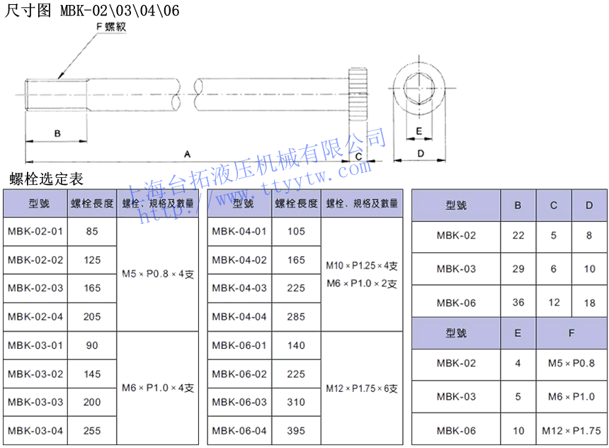 M6×P1.0×2支MBK-02-02 125 MBK-04-02 165 MBK-02-03 165 MBK-04-03 225 MBK-02-04 205 MBK-04-04 285 MBK-03-01 90 M6×P1.0×4支 MBK-06-01 140 M12×P1.75×6支 MBK-03-02 145 MBK-06-02 225 MBK-03-03 200 MBK-06-03 310 MBK-03-04 255 MBK-06-04 395 疊加閥專用螺栓MBK尺寸圖