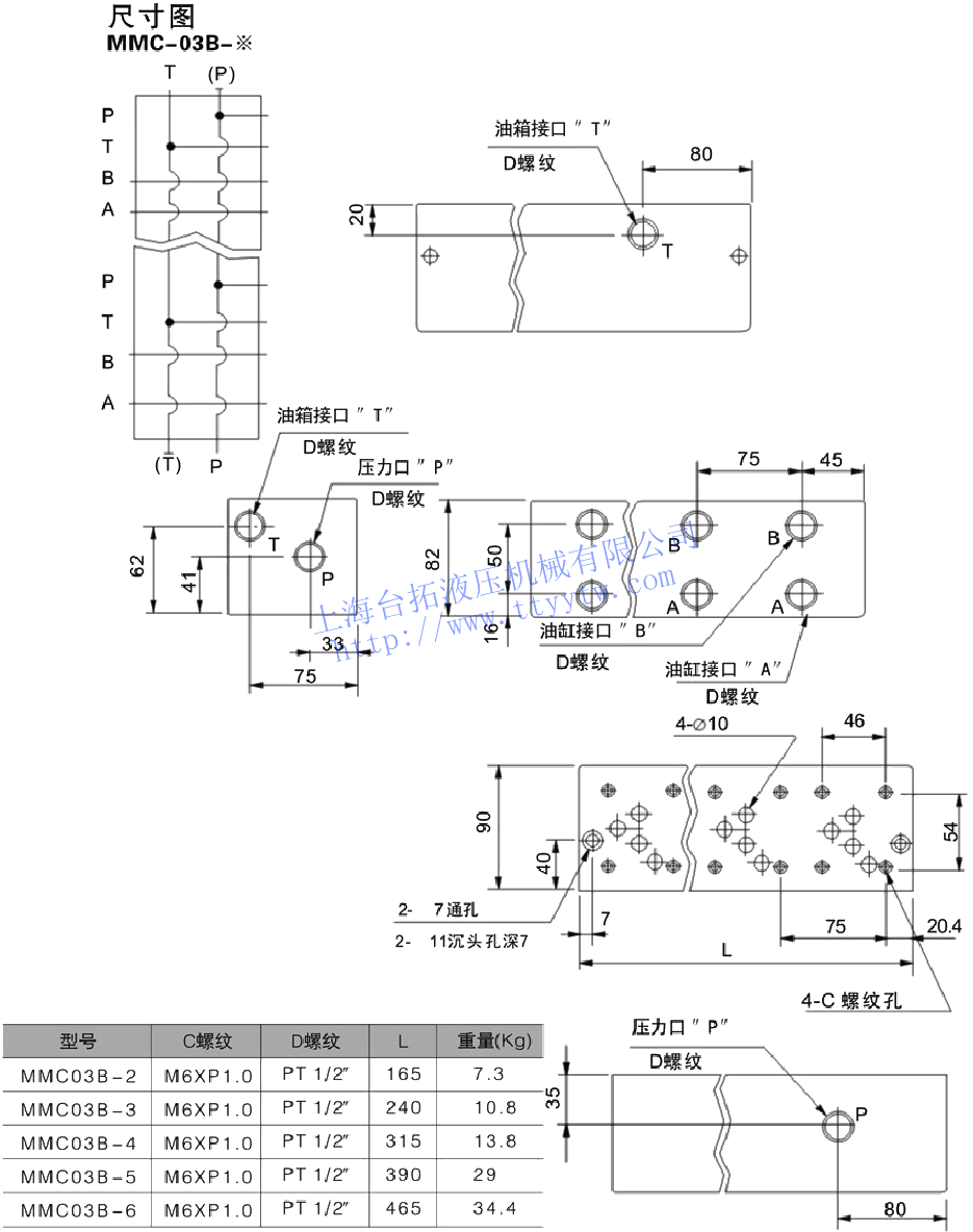 03:1~6通備注:1、標(biāo)準(zhǔn)型油路塊MMC,最高使用壓力:30MPa,最大流量: 02:40?/min 03:80?/min。2、標(biāo)準(zhǔn)型油路塊MMC,A、B出入油口位置: 標(biāo)準(zhǔn)規(guī)格為B口在上。3、標(biāo)準(zhǔn)型油路塊MMC,油口螺紋標(biāo)準(zhǔn)為PT,NPT及BSP。