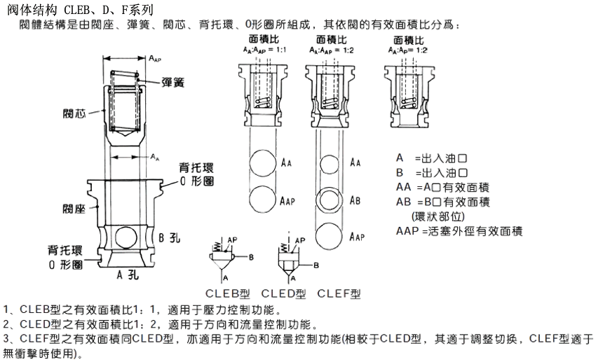 直入式插裝閥CLEB,D,F系列插裝閥功能是液控單向閥,控制方向可分單引道、多重引道、流量控制、電磁控制,有引導方向控制等。
