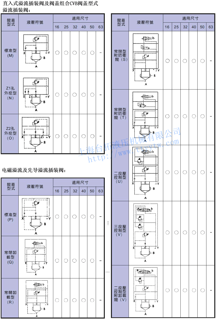 直入式溢流插裝閥及閥蓋組合CVB規(guī)格表