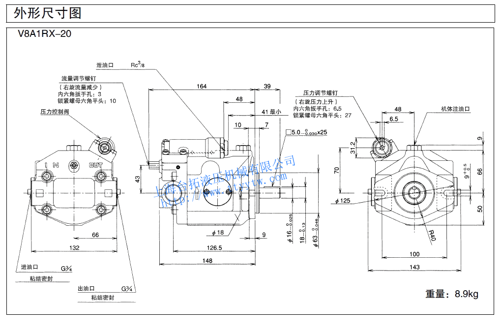 允許轉(zhuǎn)速Min?1 重量(帶控制A)kg 最大 額定 軸向口 側(cè)面口 V8 7 7 8.0 4~14.4 500~1800 - 8.9 V15 21 14 14.8 5.6~26.6 12.8 14.5 V15(Y型) 7 7 14.8 5.6~26.6 13.5 V23 25 17.5 23.0 11~41.4 18.4 21.5 V38 25 17.5 37.7 28~68 24.4 26 V50 21 14 51.6 0~93 - 50 V70 21 14 69.8 20~126 - 55 備注:1、JR-G(T)02和JRP-G02推薦用于遠(yuǎn)程控制系統(tǒng)的溢流閥。當(dāng)泄油口阻塞時,壓力補償機構(gòu)不能工作,這樣就會變成一種定量泵狀態(tài)。2、因油泵不附帶支腳、客戶可根據(jù)需求單獨訂購。