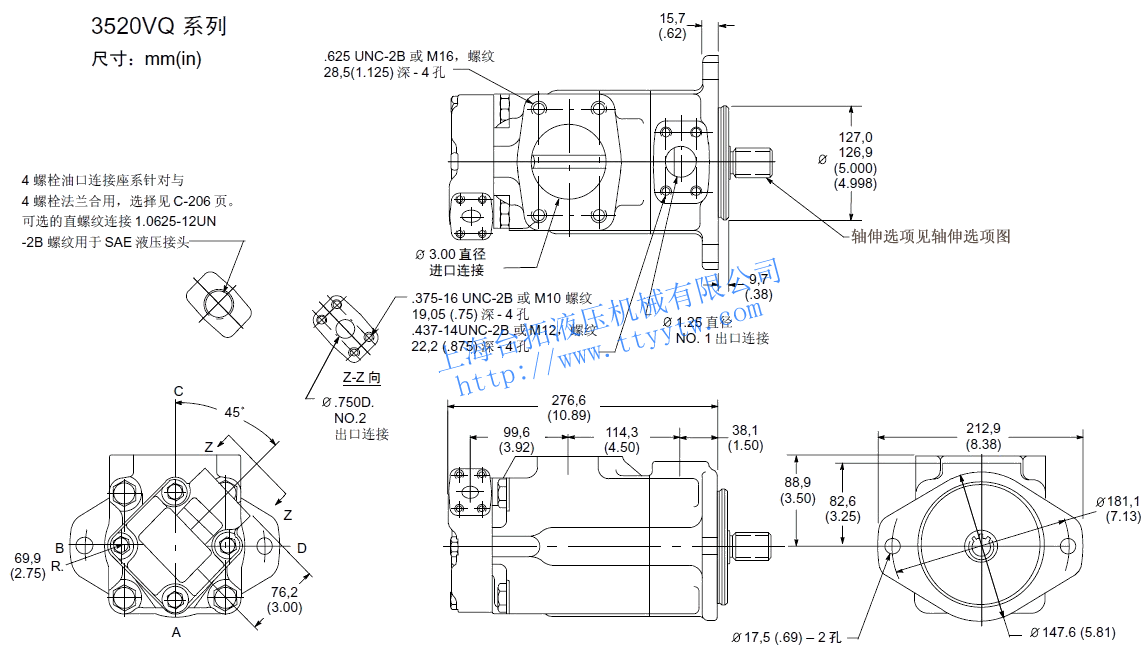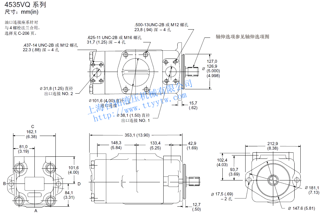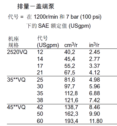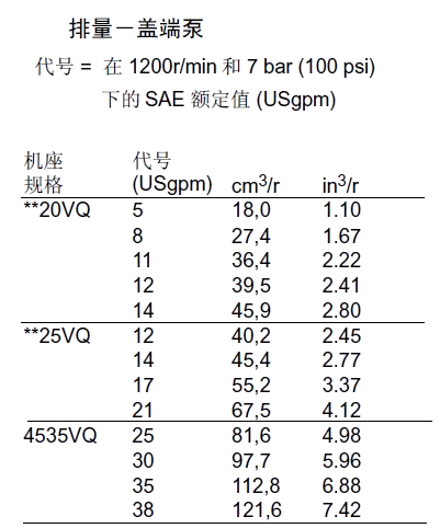 KW2520VQ 12 40.2 2700 210 88.5 41.0 5 18.0 2700 210 42.3 17.9 20.5 8 27.4 210 65.4 26.1 14 45.4 2700 103.8 46.6 11 36.4 210 88.5 35.4 17 55.2 2500 119.2 51.8 12 39.5 160 98.1 28.4 21 67.7 2500 146.2 61.9 14 45.9 140 115.4 29.1 3520VQ 25 81.6 2500 210 173.1 75.3 5 18.0 2500 210 38.5 16.5 34.0 8 27.4 210 61.5 24.0 30 97.7 2500 211.5 87.7 11 36.4 210 80.8 33.0 35 112.8 2400 230.8 98.5 12 39.5 160 90.4 26.1 38 121.6 2400 250.0 104.4 14 45.9 140 105.8 26.8 3525VQ 25 81.6 2500 210 173.1 75.3 12 40.2 2500 210 79.5 38.0 34.5 30 97.7 2500 211.5 87.7 14 45.4 210 91.0 43.0 35 112.8 2400 230.8 98.5 17 55.2 210 119.2 51.5 38 121.6 2400 250.0 104.4 21 67.5 210 146.2 61.9 4520VQ 42 138.7 2200 175 255.8 91.4 5 18.0 2200 210 32.0 14.5 43.0 8 27.4 210 51.0 21.0 50 162.3 2200 303.8 105.2 11 36.4 210 68.0 28.5 12 39.5 160 77.5 23.0 60 193.4 2200 369.2 126.8 14 45.9 140 91.0 24.0 4525VQ 42 138.7 2200 175 255.8 91.4 12 40.2 2200 210 68.0 33.0 46.0 14 45.4 210 79.5 38.0 50 162.3 2200 303.8 105.2 17 55.2 210 100.0 45.5 60 193.4 2200 369.2 126.8 21 67.5 210 125.0 54.5 4535VQ 42 138.7 2200 175 255.8 91.4 25 81.6 2200 210 145.5 66.5 53.6 30 97.7 210 178.0 77.5 50 162.3 2200 303.8 105.2 35 112.8 210 211.5 89.5 60 193.4 2200 369.2 126.8 38 121.6 210 223.0 97.0 備注:性能常數(shù):SAE 10W油液@82℃(180華氏度),泵進(jìn)口@0PSIG(14.7PSIA),出口壓力必須始終高于進(jìn)口壓力。