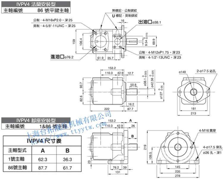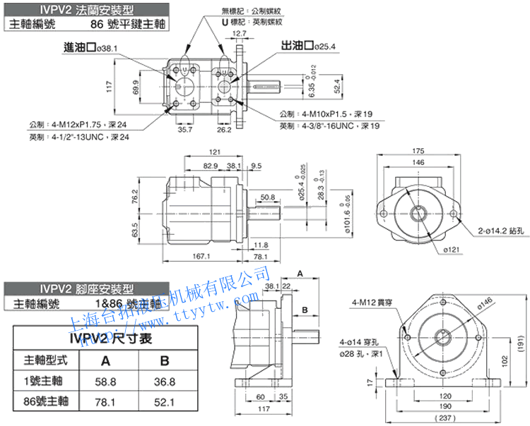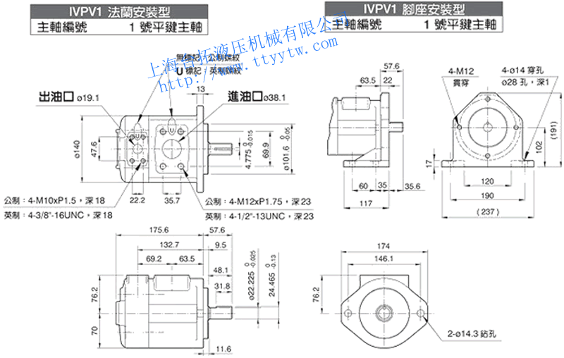 (r/min)法蘭型 腳座型 IVPV1 2 7.5 138 1800 138 1500 138 1200 600 18.5 21.5 3 10.2 4 12.8 207 157 5 16.7 6 19.2 7 22.9 8 26.2 10 31.0 11 35.0 12 37.9 157 138 14 44.2 138 IVPV2 10 32.5 172 1800 157 1500 138 1200 600 29.5 39 12 38.3 14 43.3 15 46.7 17 52.5 19 59.2 21 65.0 25 78.6 138 138 IVPV3 17 53.3 172 1800 157 1500 138 1200 600 43 52.5 21 66.7 25 79.2 30 95.0 32 100 35 109 38 118 42 134 138 138 IVPV4 30 96.0 172 1800 157 1500 138 1200 600 71 96 35 109 38 128 42 134 50 156 60 189 67 210 157 138 75 236 138 備注:●代號(hào)是在1200r/min和6.9bar下的額定容量US gpm?!镉浱?hào),允許0.5秒以內(nèi),超過(guò)"最高使用壓力"10%的瞬間(尖峰)壓力。