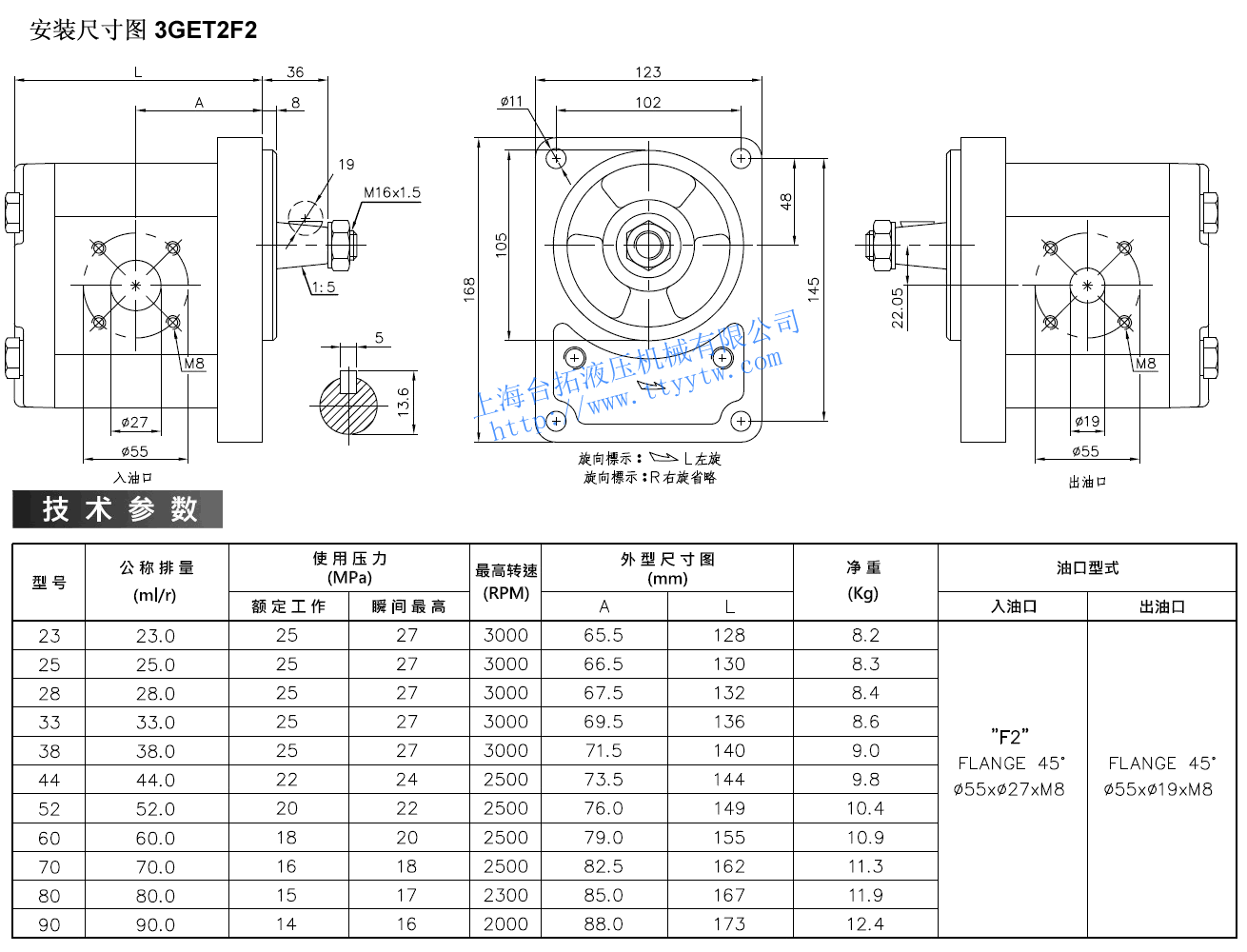 ?55×?19×M83GET2F225 25.0 25 27 3000 66.5 130 8.3 3GET2F228 28.0 25 27 3000 67.5 132 8.4 3GET2F233 33.0 25 27 3000 69.5 136 8.6 3GET2F238 38.0 25 27 3000 71.5 140 9.0 3GET2F244 44.0 22 24 2500 73.5 144 9.8 3GET2F252 52.0 20 22 2500 76.0 149 10.4 3GET2F260 60.0 18 20 2500 79.0 155 10.9 3GET2F270 40.0 16 18 2500 82.5 162 11.3 3GET2F280 80.0 15 17 2300 85.0 167 11.9 3GET2F290 90.0 14 16 2000 88.0 173 12.4 高壓齒輪泵3GET2F2尺寸圖