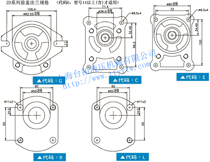 2 D G 1 B P 16 14 R 系列 型式/功能 前蓋法蘭規(guī)格 軸伸規(guī)格 2進油口數(shù) 出入油口規(guī)格 前泵排量 后泵排量 旋向(R,L) 備注:1、R表示右轉,面向軸伸順時針;L表示左轉,面向軸伸逆時針。2、假設您選前蓋法蘭為G,軸伸代碼為1,二進油口代碼為B,出入油口規(guī)格代碼為P,選用排量是16&14ml/r,旋向是右旋,正確的訂購型號:2DG1BP1614R。