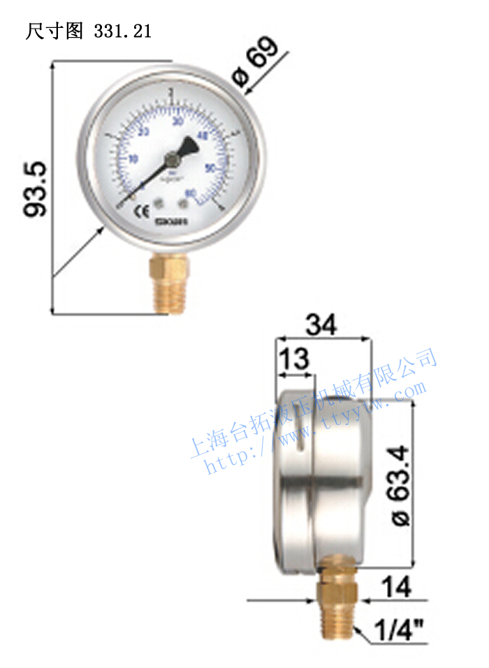 型號 充油式壓力表331.21 尺寸大小 63mm 精確度 Class±1.5% 壓力范圍 -1/0~-1+20kg/cm2(bar) 0/1~0/1000kg/cm2(bar) 溫度范圍限制 運(yùn)轉(zhuǎn)時溫度最大值60℃(因考慮傳導(dǎo)特性),周圍溫度約-25℃~60℃ 接頭尺寸與材料 銅合金,直立或埋入