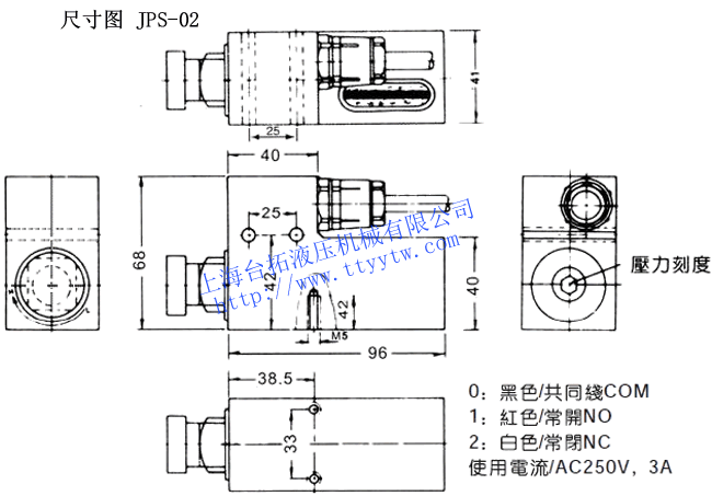 型號 使用壓力范圍 Mpa 最高使用壓力 Mpa 重量 Kg JPS-02HM 3~21 21 1.45 JPS-02L 2.5~6 7 JPS-02LL 0.5~6 7 備注:其它規(guī)格:1.建議切換頻率最大20次/分。2.絕緣阻抗:100MΩmin。(電磁500V測試)3.接點阻抗:30MΩMax。4.電介體強度:1000VAC 50/60HZ測試(1分鐘)。