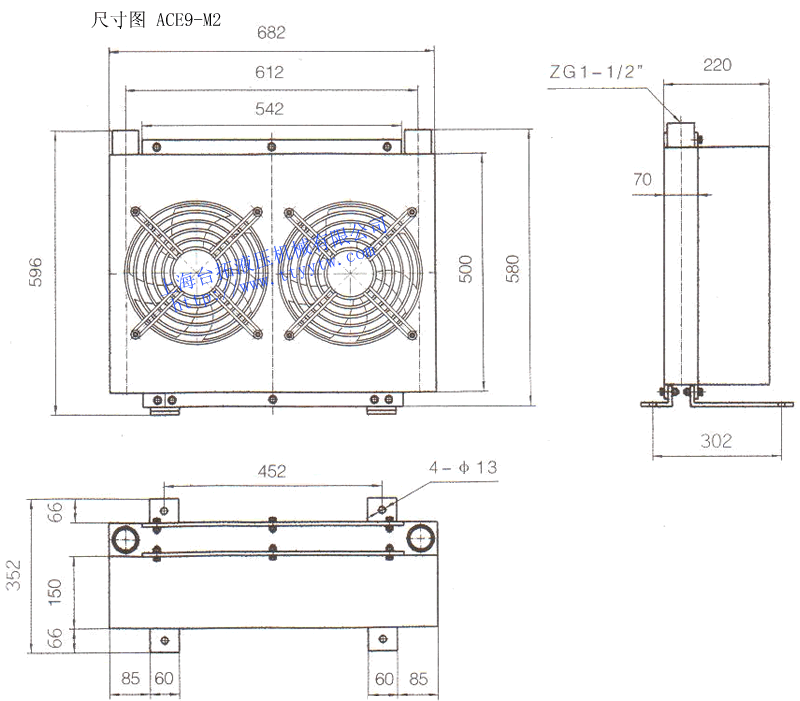 型號 牙口ZG 通過量?/min 工作壓力MPa 最高壓力MPa 風扇功率W ACE1-M2 M18×1.5 10 2.0 2.5 30 ACE2-M2 M18×1.5 20 2.0 2.5 40 ACE3-M1 M18×1.5 25 2.0 2.5 65 ACE4-M1 M22×1.5 30 2.0 2.5 65 ACE4-M2 M22×1.5 60 2.0 2.5 130 ACE5-M1 M27×1.5 55 2.0 2.5 100 ACE6-M1 M27×2 100 2.0 2.5 200 ACE7-M1 M33×2 120 2.0 2.5 100 ACE8-M1 M33×2 160 2.0 2.5 200 ACE9-M2 ZG1-1/2" 250 2.0 2.5 200 ACE10-M2 ZG1-1/2" 300 2.0 2.5 400 ACE11-M3 ZG1-1/2" 400 2.0 2.5 600 風冷機ACE系列外形尺寸圖