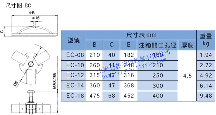 型號(hào) 重量 Kg EC-08 1.94 EC-10 2.72 EC-12 4.92 EC-14 6.14 EC-18 9.48 油箱側(cè)蓋EC尺寸圖
