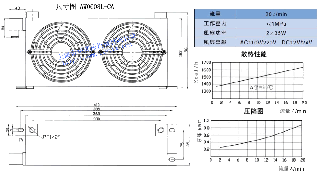 型號(hào) 牙口(ZG) 通過量?/min 工作壓力Mpa 最高壓力Mpa 風(fēng)扇功率W AW0607-CA 1/2" 20 1 1.5 35 AW0608-CA 1/2" 20 1 1.5 35 AW0608W-CA 1/2" 20 1 1.5 2×35 AW0608L-CA 1/2" 20 1 1.5 2×35 風(fēng)冷機(jī)AW0607,AW0608外形尺寸圖