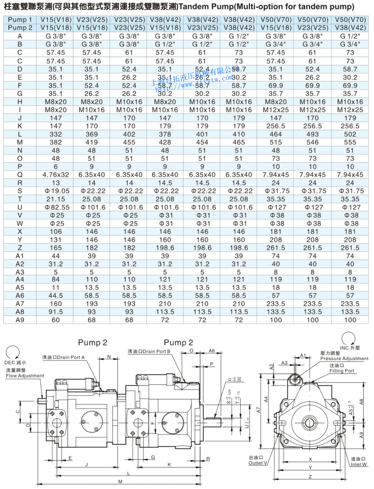 4:2-25500 1800 28.5 V23A-23A 23.0/23.0 34.5/34.5 41.4/41.4 46.5 V15A-38A 15/37.8 22.5/56.7 27/68 41.5 V38A-38A 37.8/37.8 56.7/56.7 68/68 54.5 V15A-70A 21 15.0/69.7 22.5/104.5 27/125.4 71.5 V38A-70A 37.8/69.7 56.7/104.5 68/125.4 84.5 雙聯(lián)變量柱塞泵V系列尺寸圖